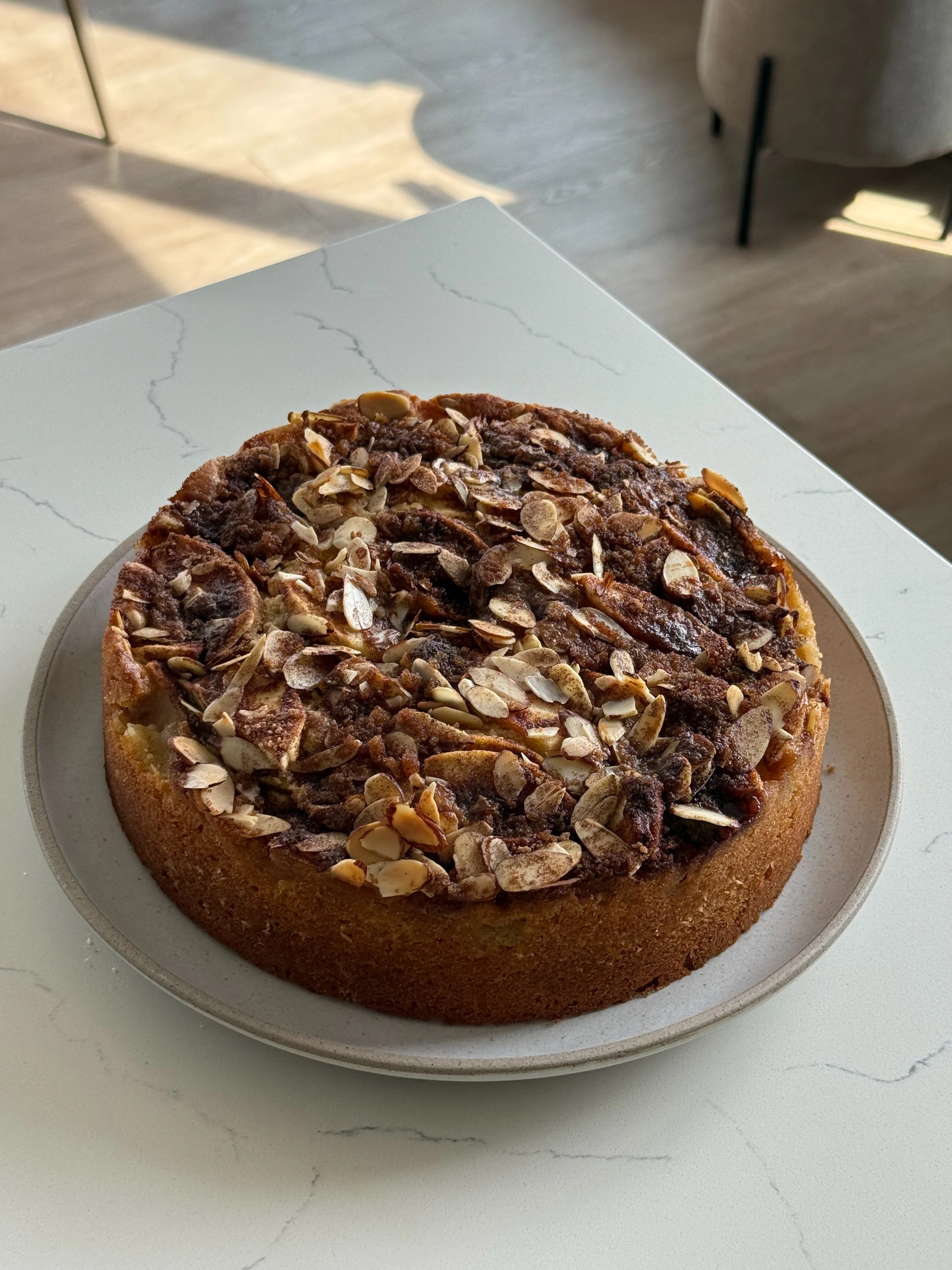 I make this version of an apple cake all of the time this time of the year. It is a spiff off of a Norwegian apple cake (eplekake), and it is basically a better version of a coffee cake. This cake has a nutty base thanks to rye flour, tart green Granny Smith apples, and is adorned with a layer of brown sugar, cinnamon, sliced almonds, and my favorite spice—cardamom. This is the perfect cake to ring in fall. Whether you are celebrating the Jewish High Holidays coming up, the beginning of fall, or just want to bake a delicious cake for a mid-afternoon fika treat, this recipe is perfect for everything and anything.