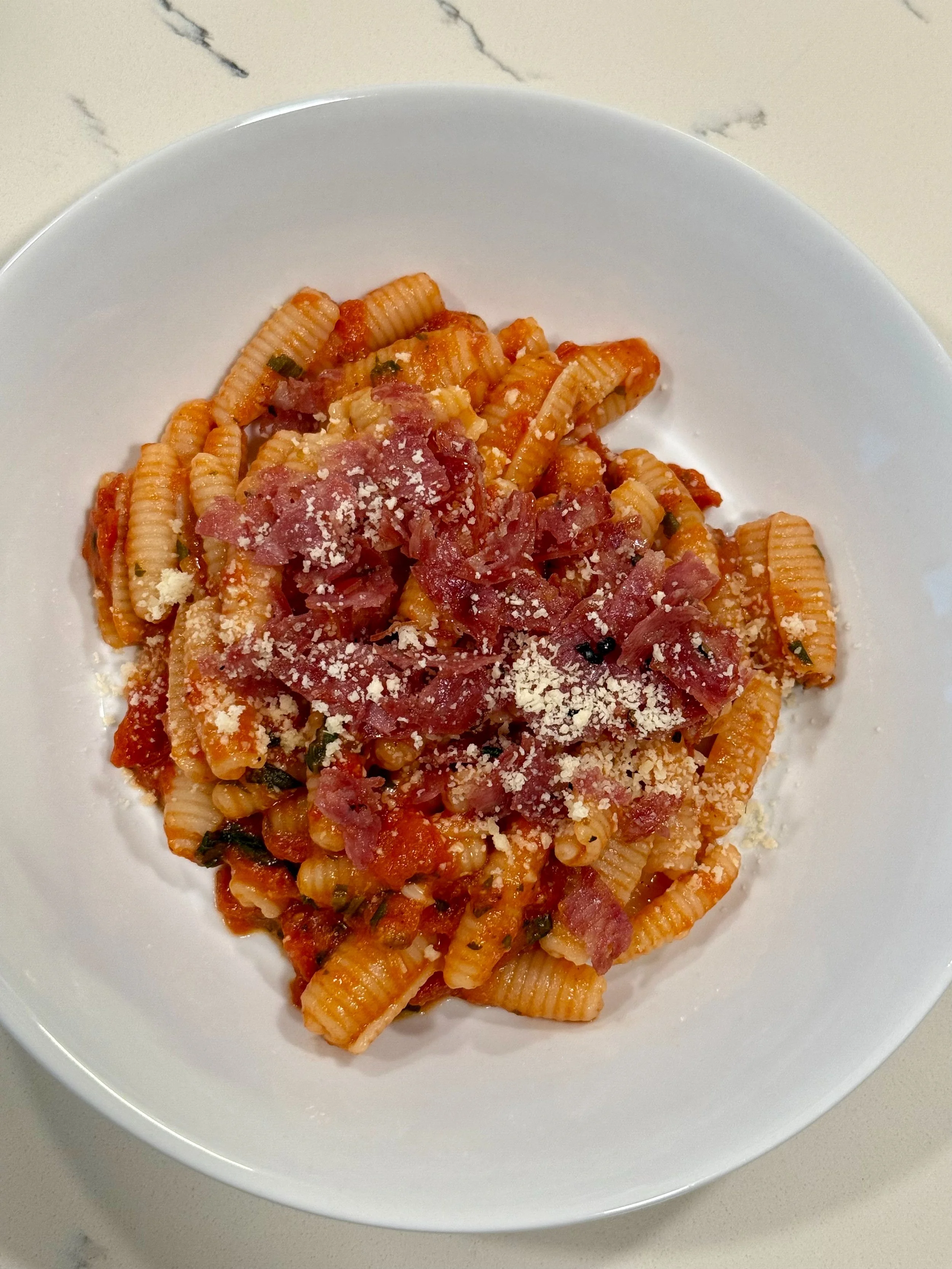 Crispy Salami Pasta with Homemade Tomato Sauce