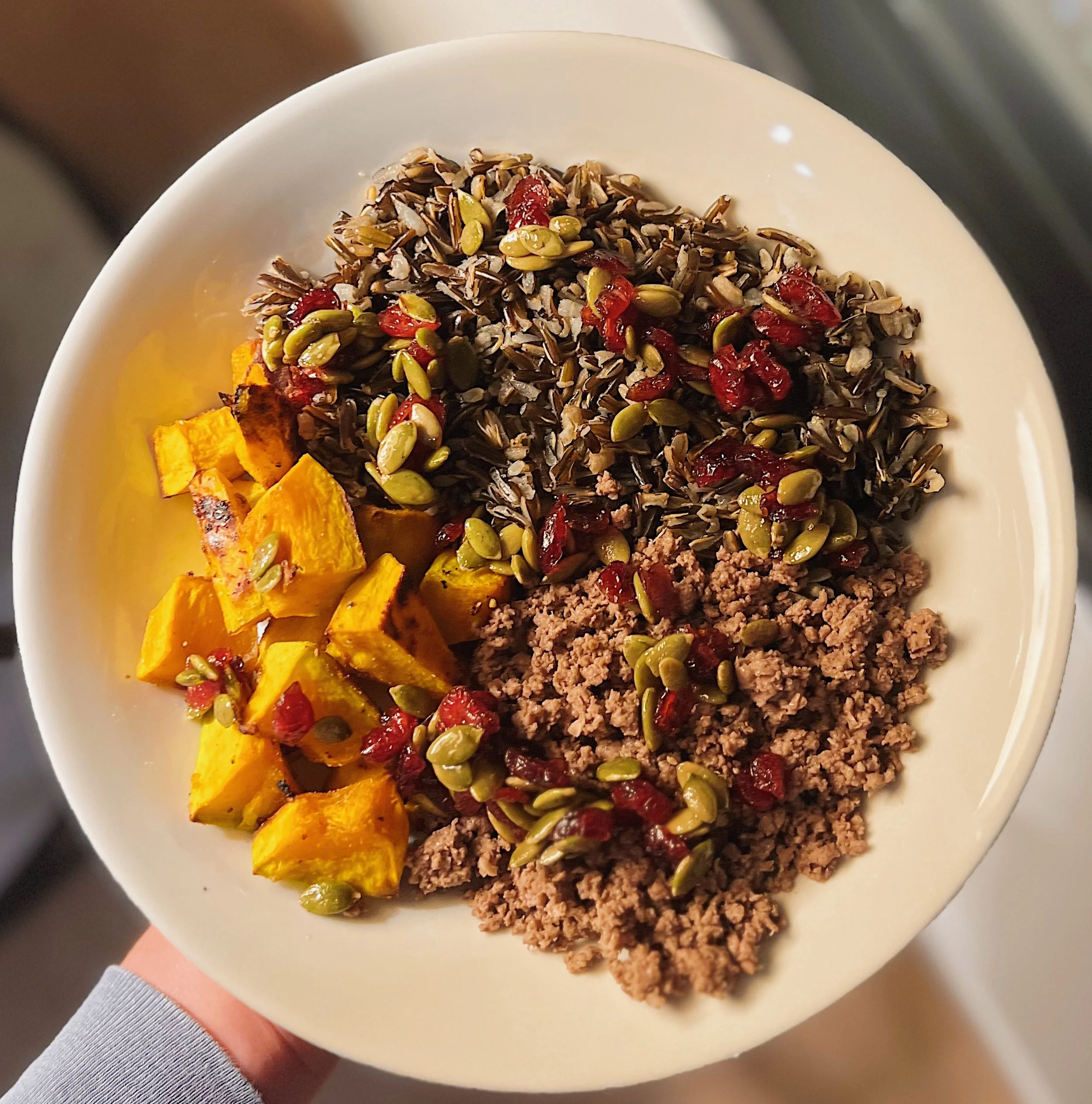 Assemble your bowls! I like to do my bowl with 1/2 wild rice, 1/4 squash, 1/4 bison, and sprinkle the sticky maple pumpkin seeds and cranberries all over. Enjoy! :)