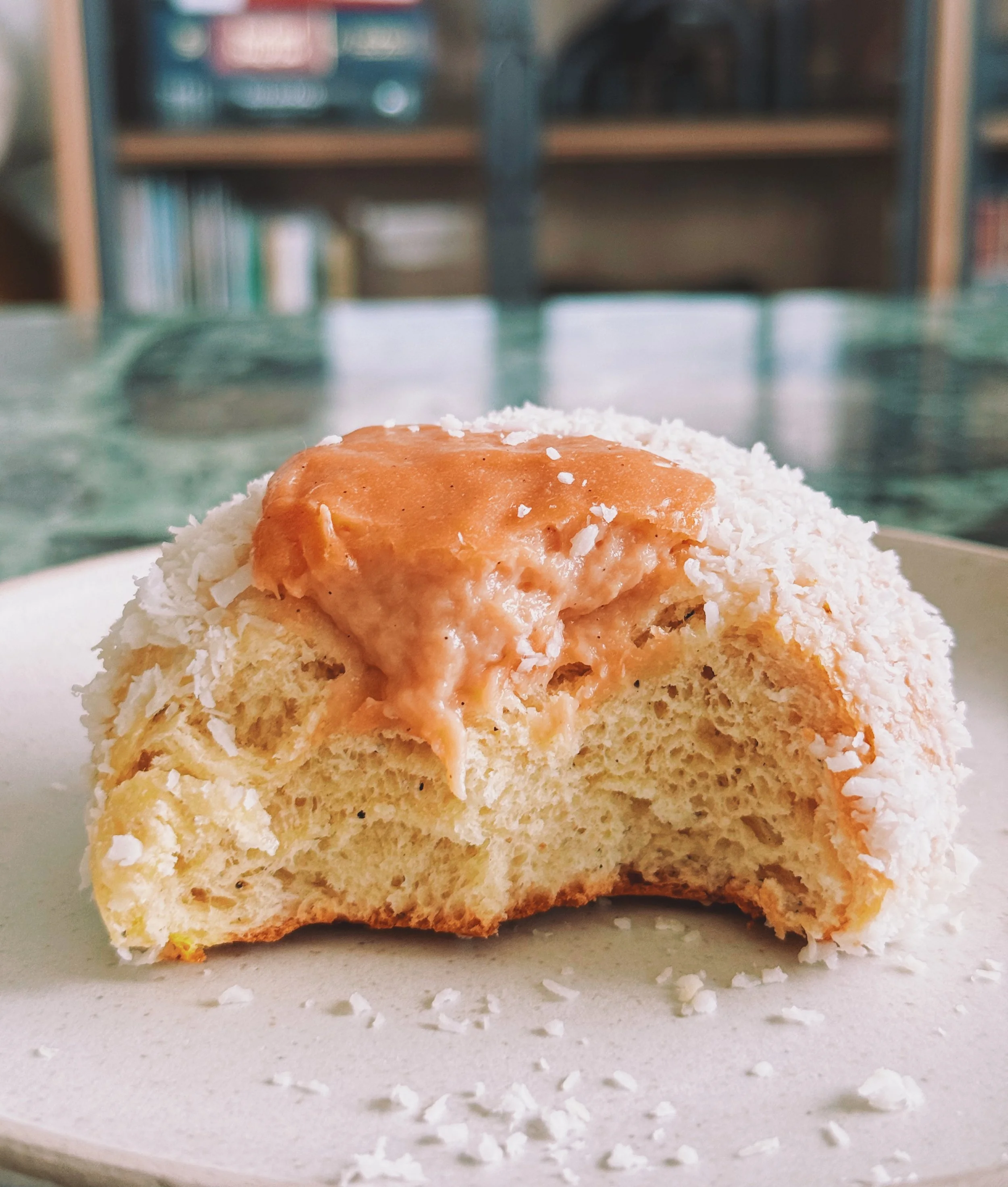 It is a tender, soft, pillowy cardamom-infused bun traditionally baked with a vanilla custard and coated with white icing and shredded coconut. It’s my all-time favorite pastry. I wanted to add a spring twist to these by adding homemade rhubarb puree to the custard. This gives it a nice tang, and the rhubarb pairs wonderfully with the cardamom and coconut.