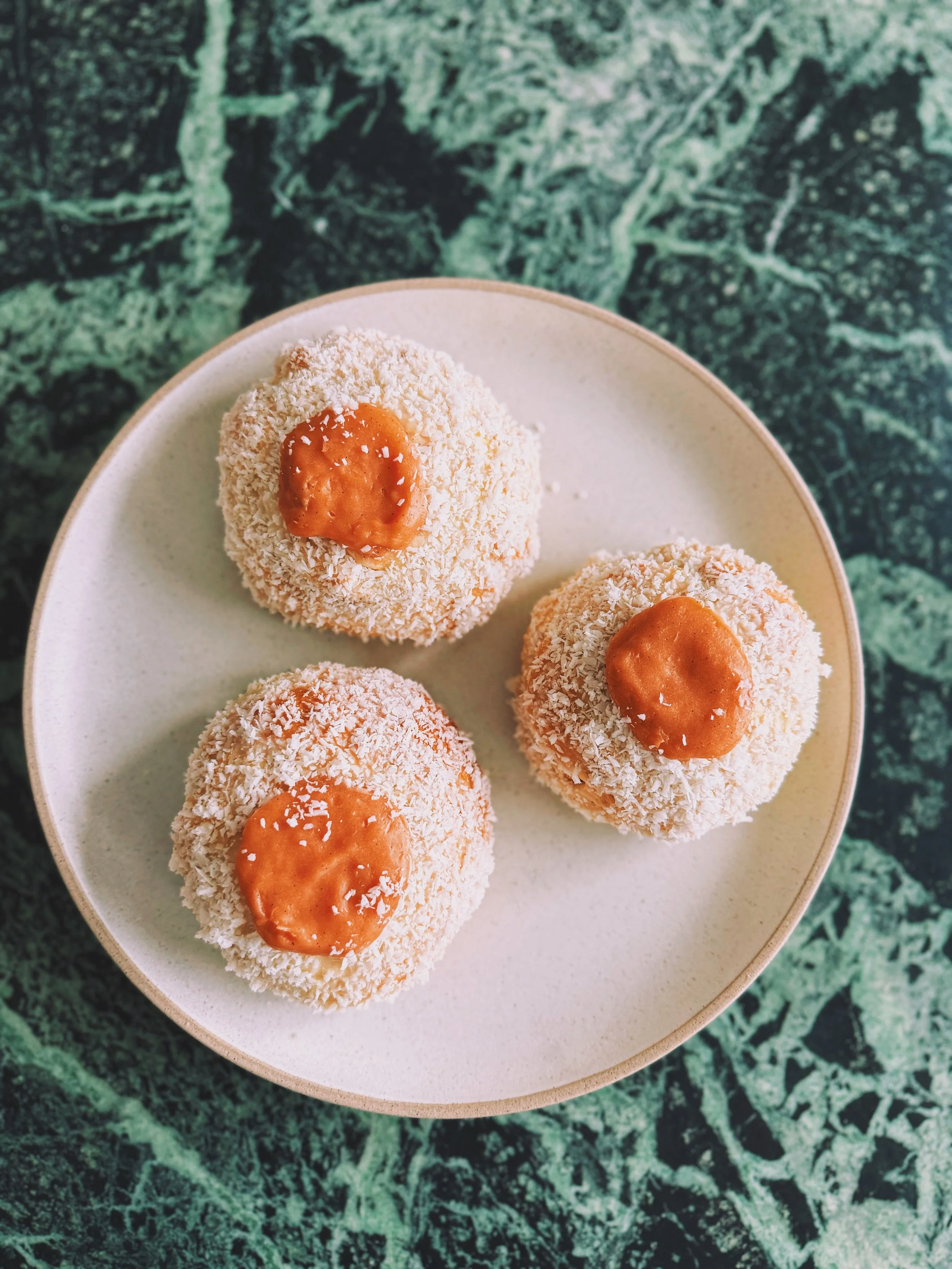 Once the buns are slightly cooled but still warm, brush the icing onto them (avoid the custard). Then, immediately transfer them to the bowl of coconut and pack the coconut onto the iced parts of the bun.